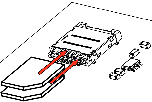 Установка SIM-карт в роутер происходит уголком наружу, контактами вниз. Роутер поддерживает установку двух SIM-карт, в таком случае они будут устанавливаться параллельно друг другу, но на разной высоте.